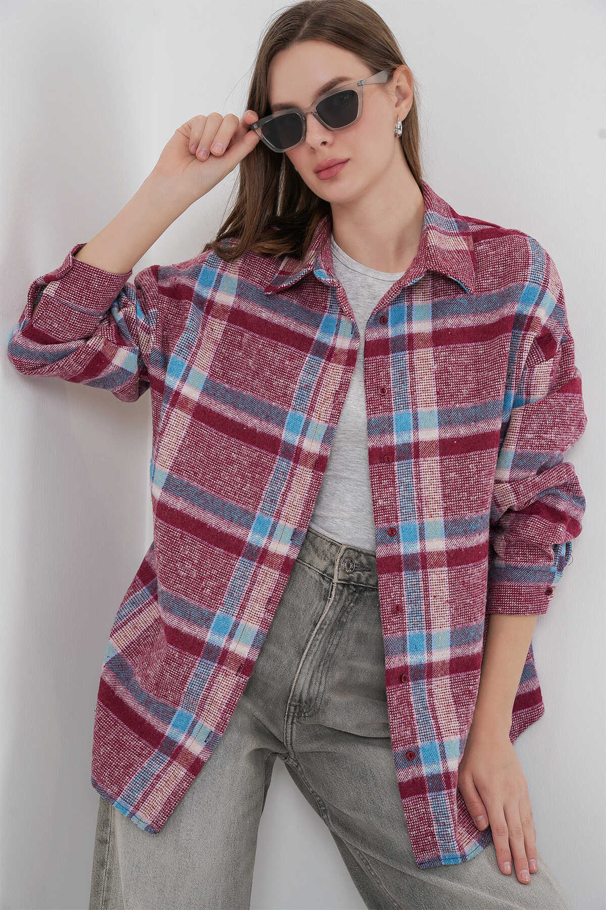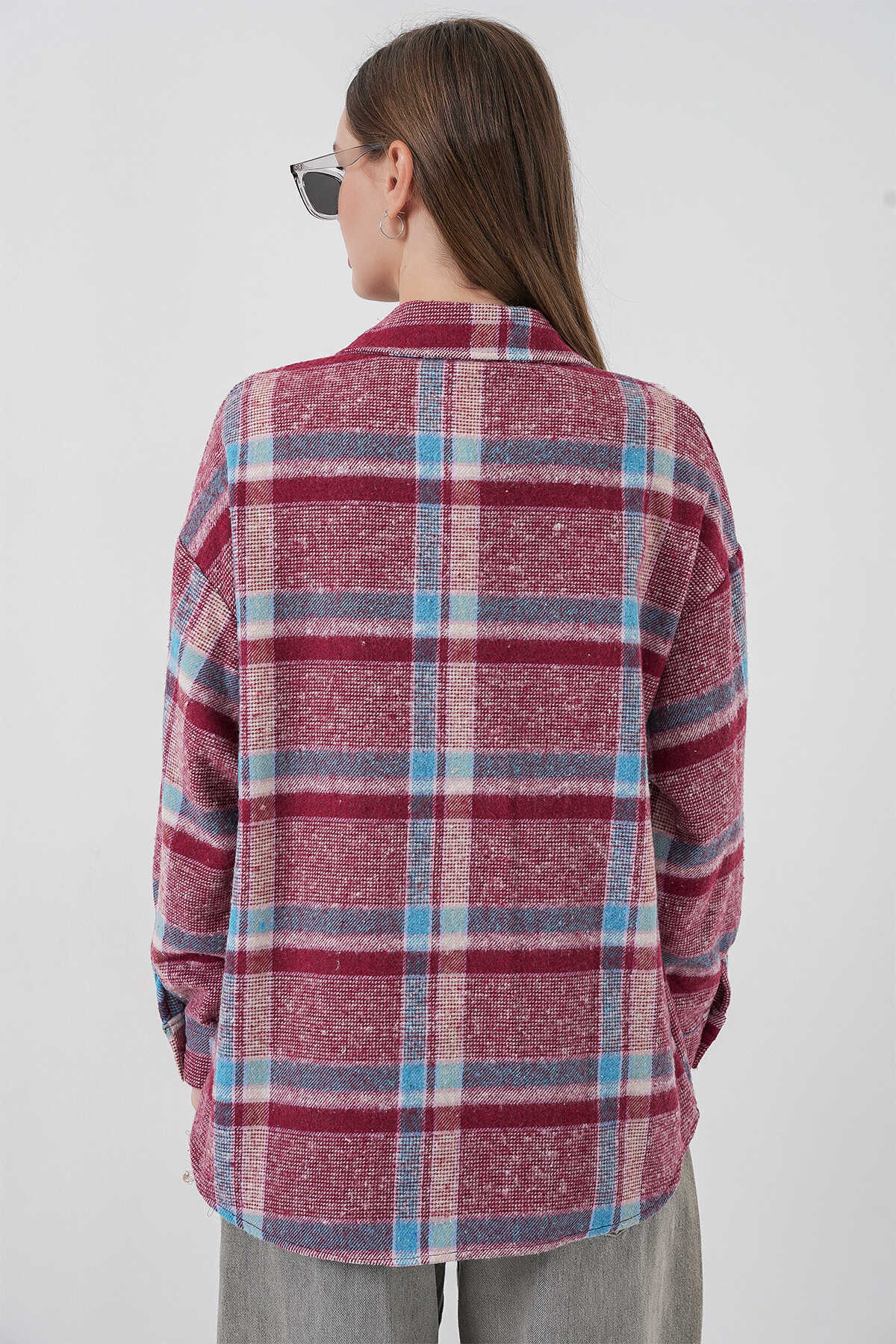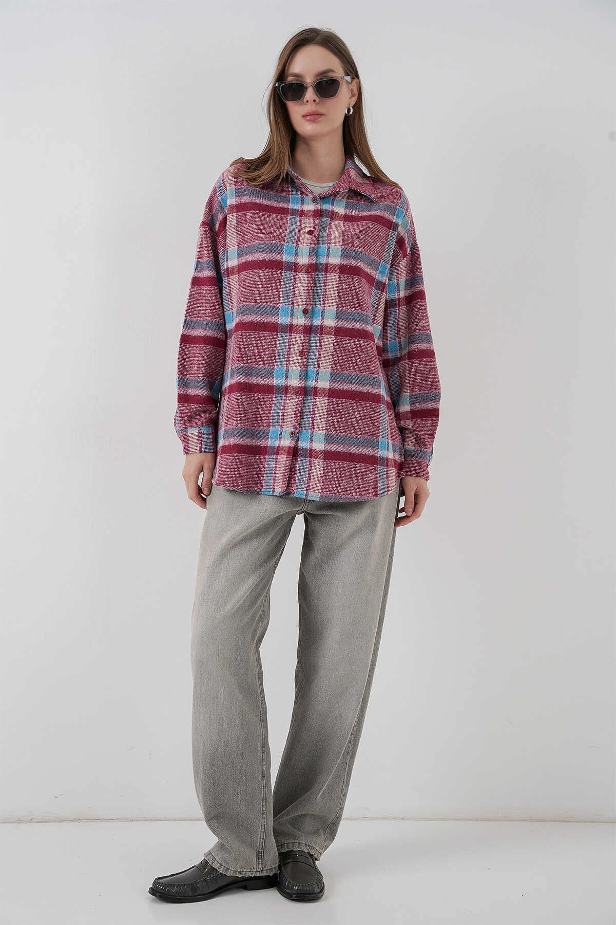 Kadin Ekose Desen Dügmeli Oversize Oduncu Gömlek