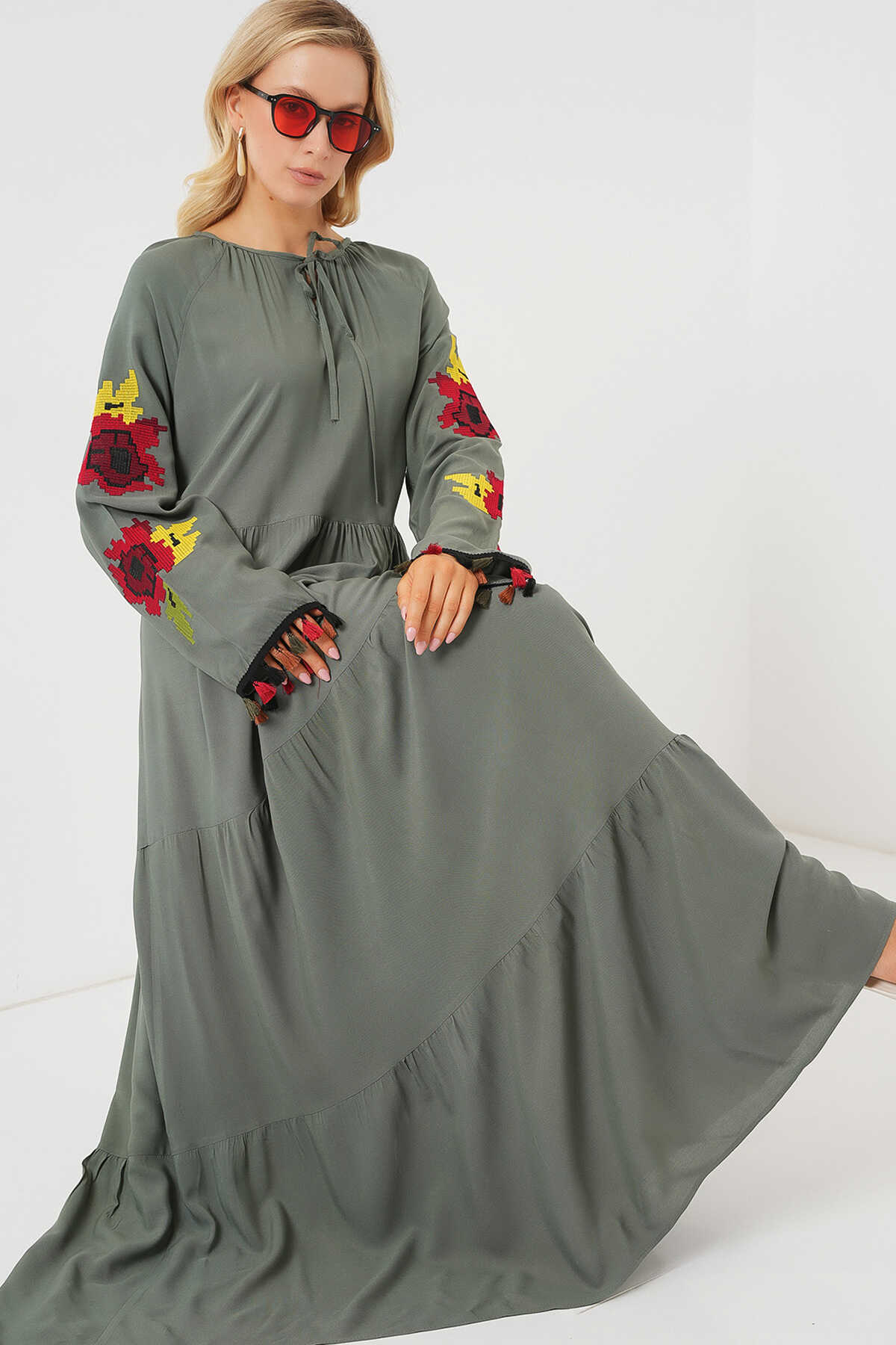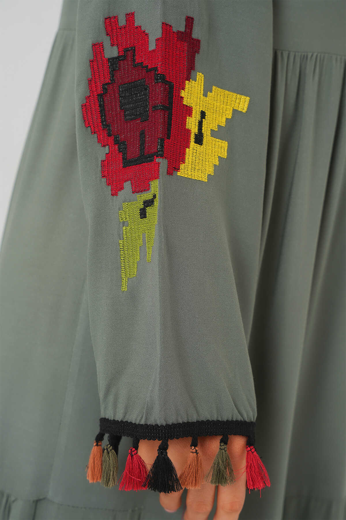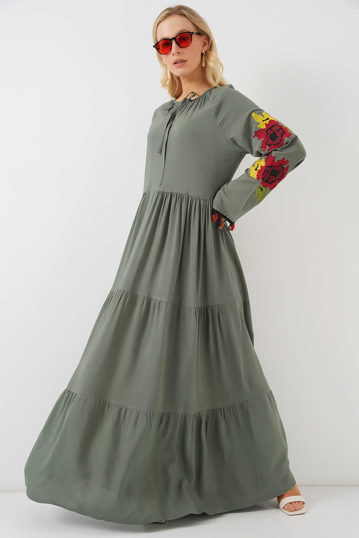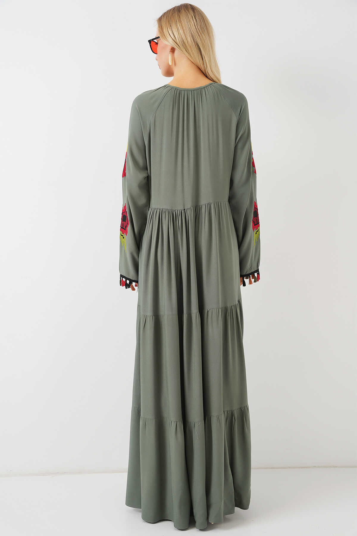 Nakışlı Uzun Elbise 2534 - Haki