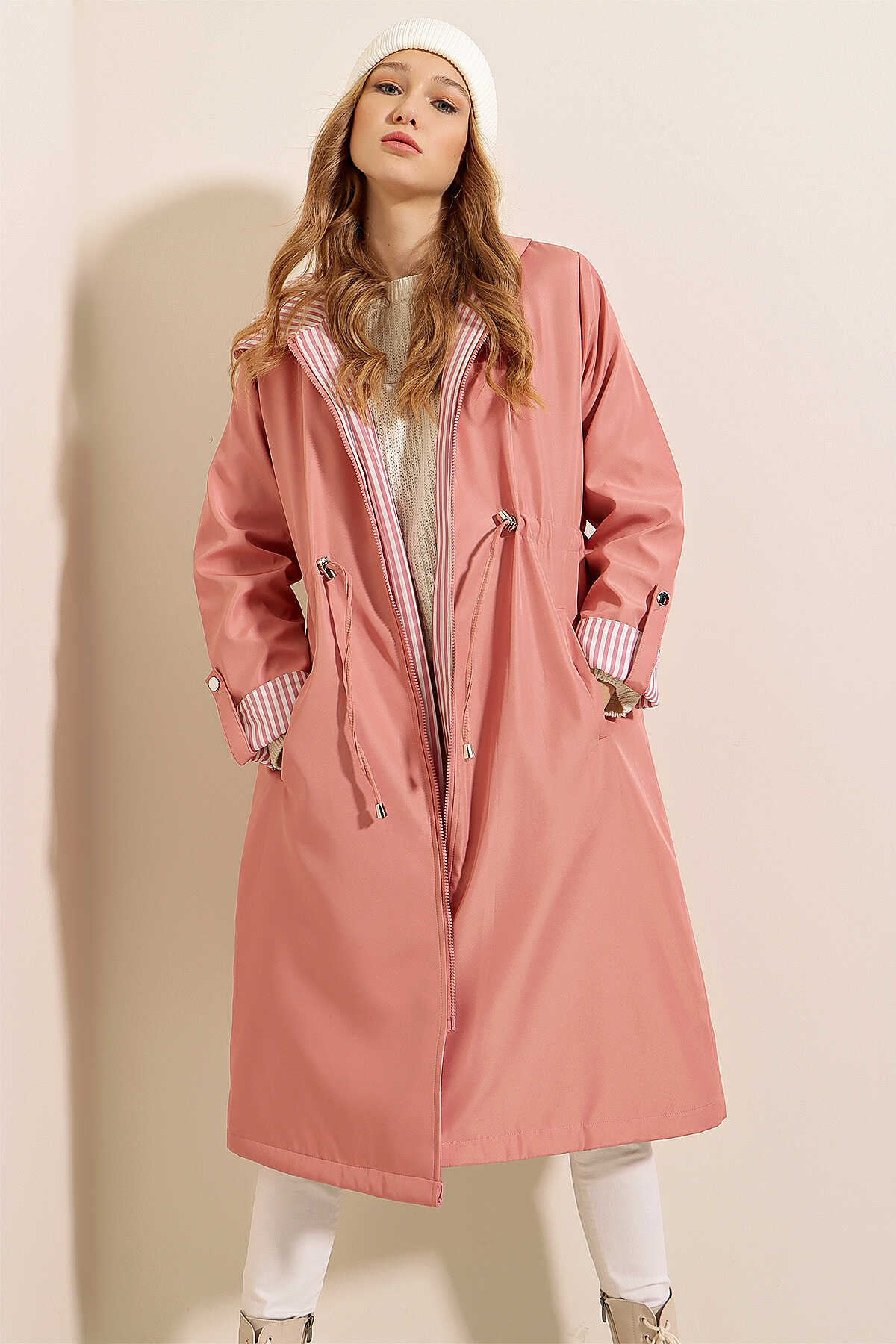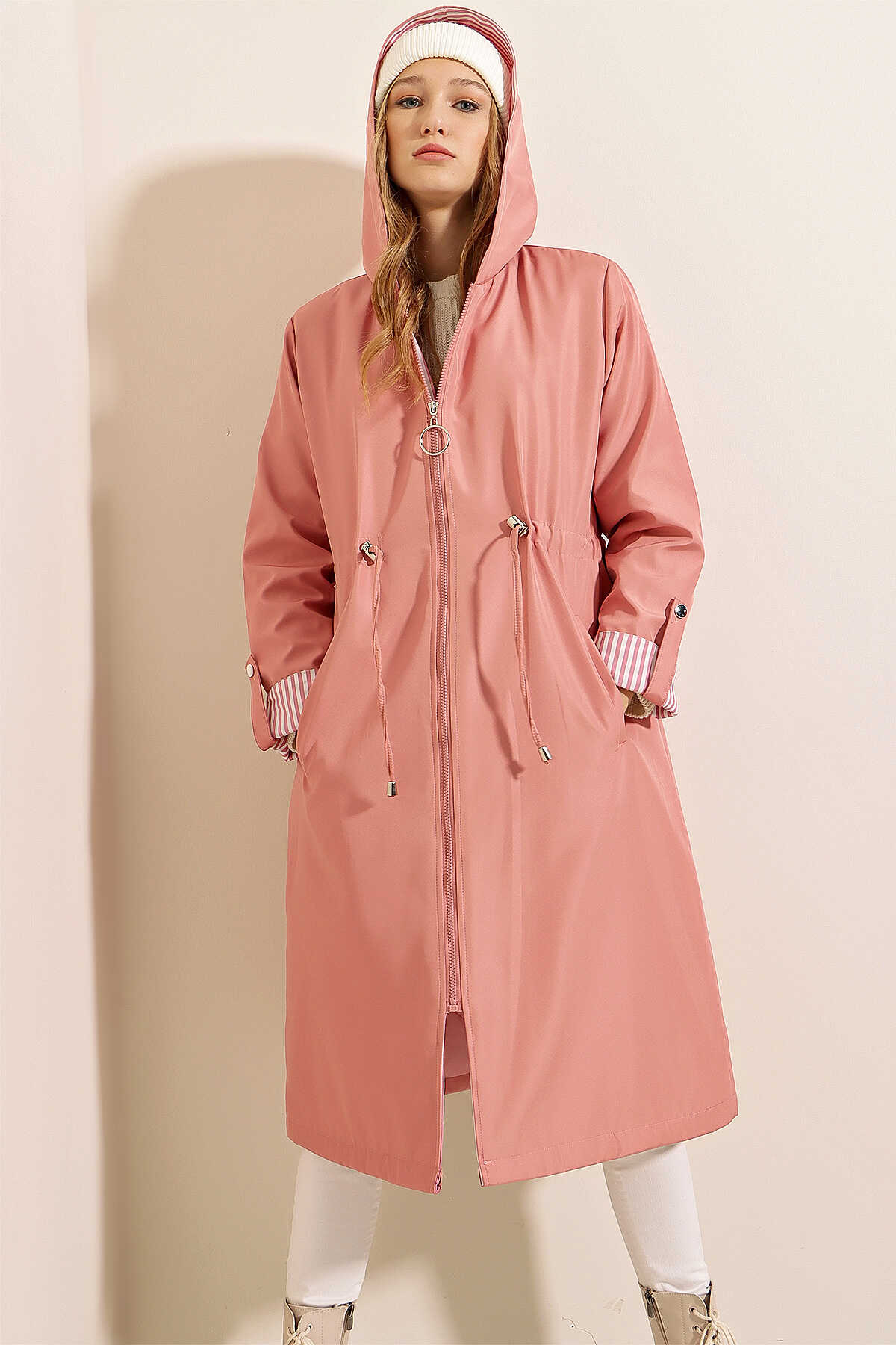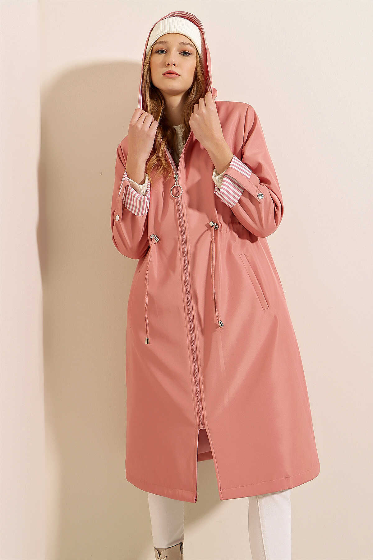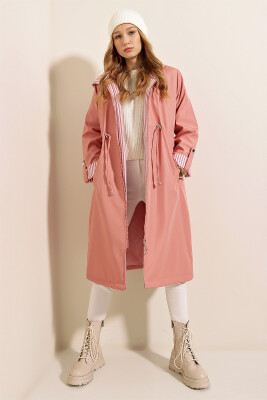 9091 Beli Büzgülü Kapşonlu Trençkot - Pembe - Kombin