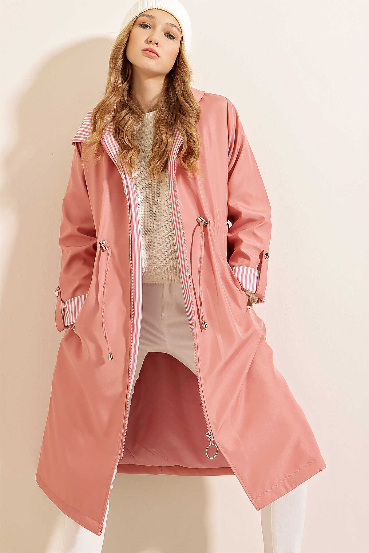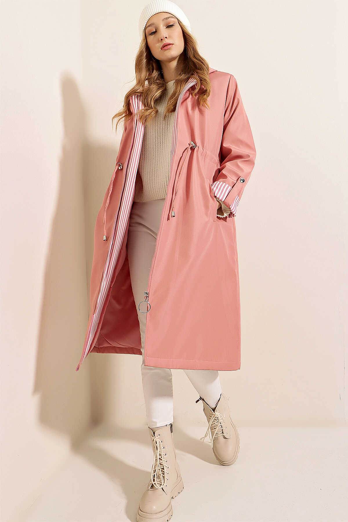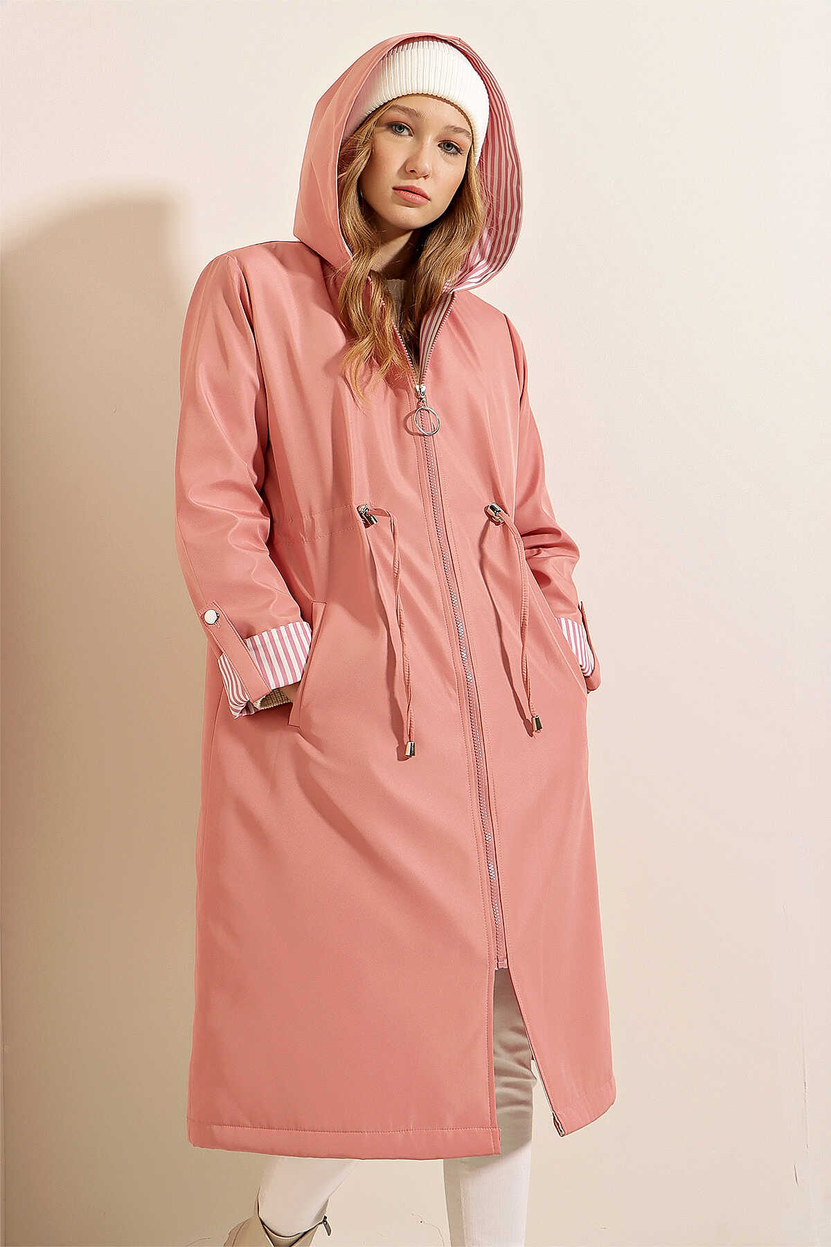 9091 Beli Büzgülü Kapşonlu Trençkot - Pembe - Kombin