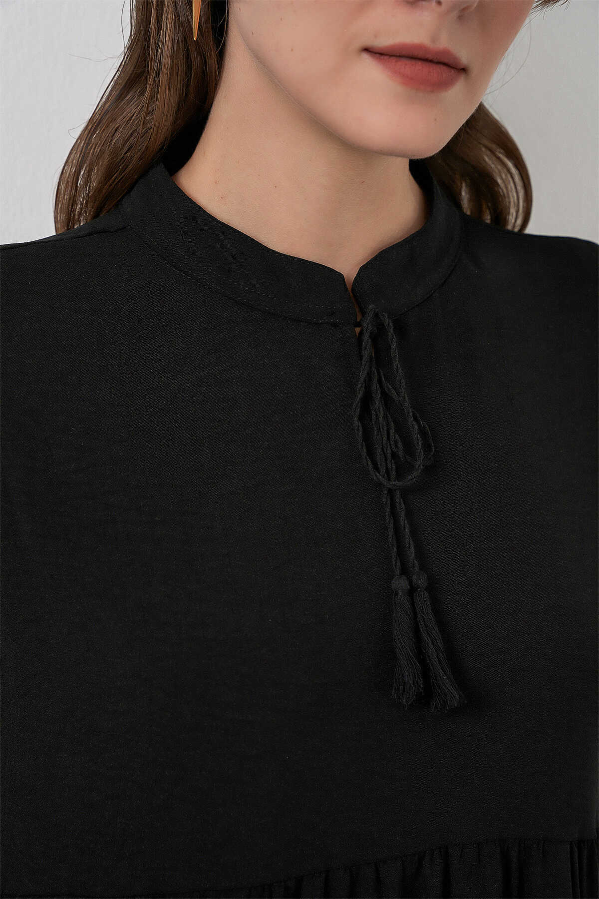 T1627 Yaka Bağcıklı Elbise - Siyah