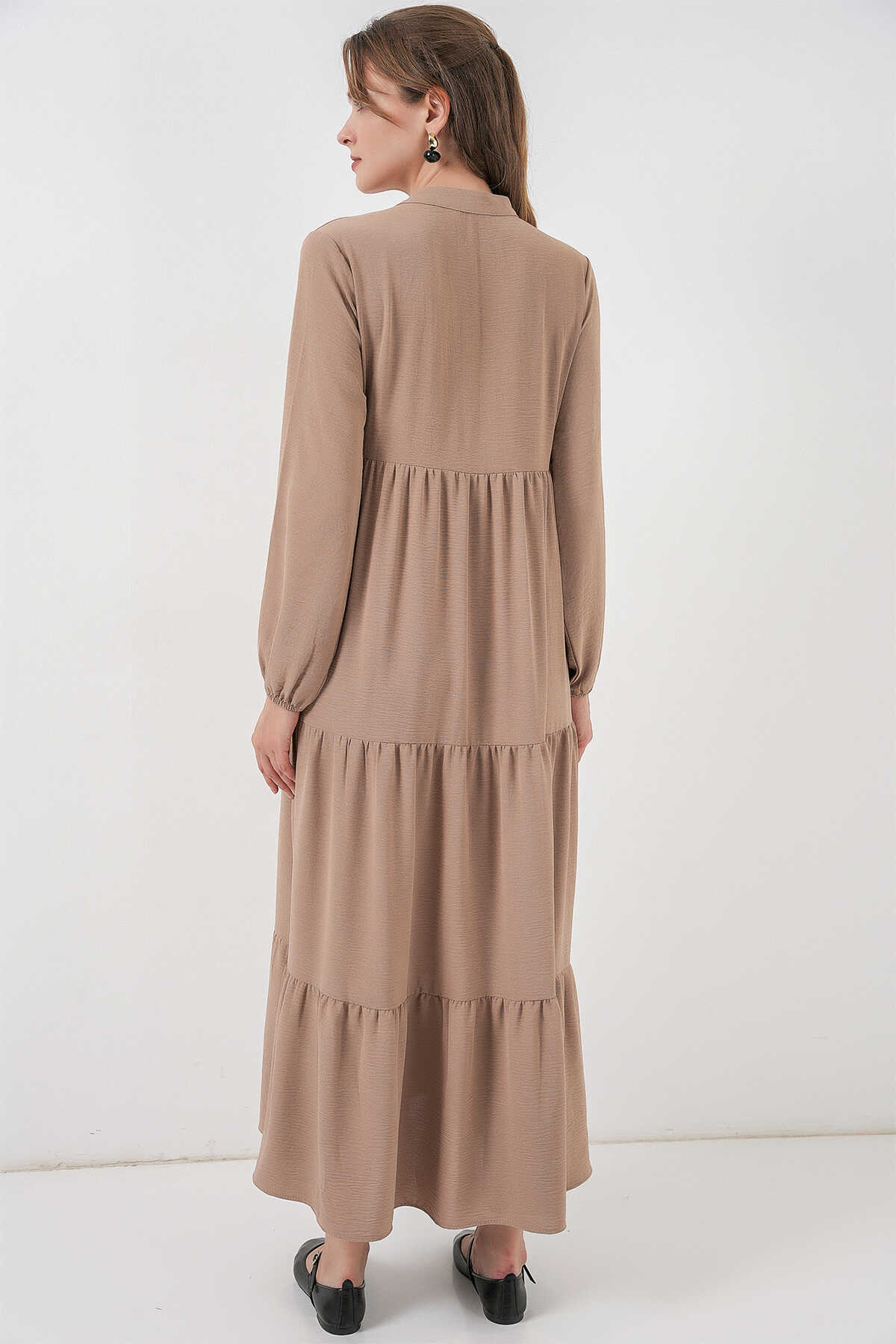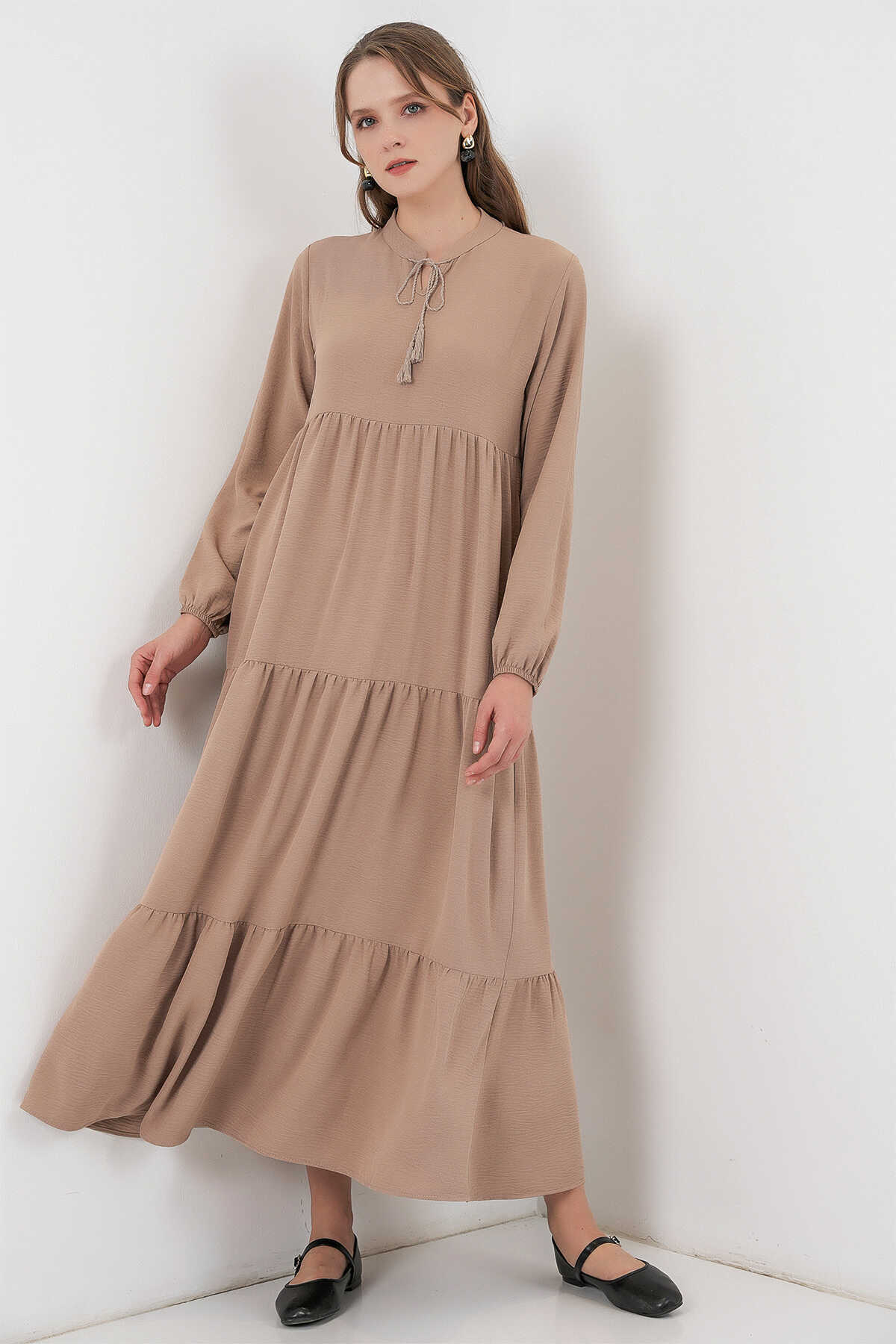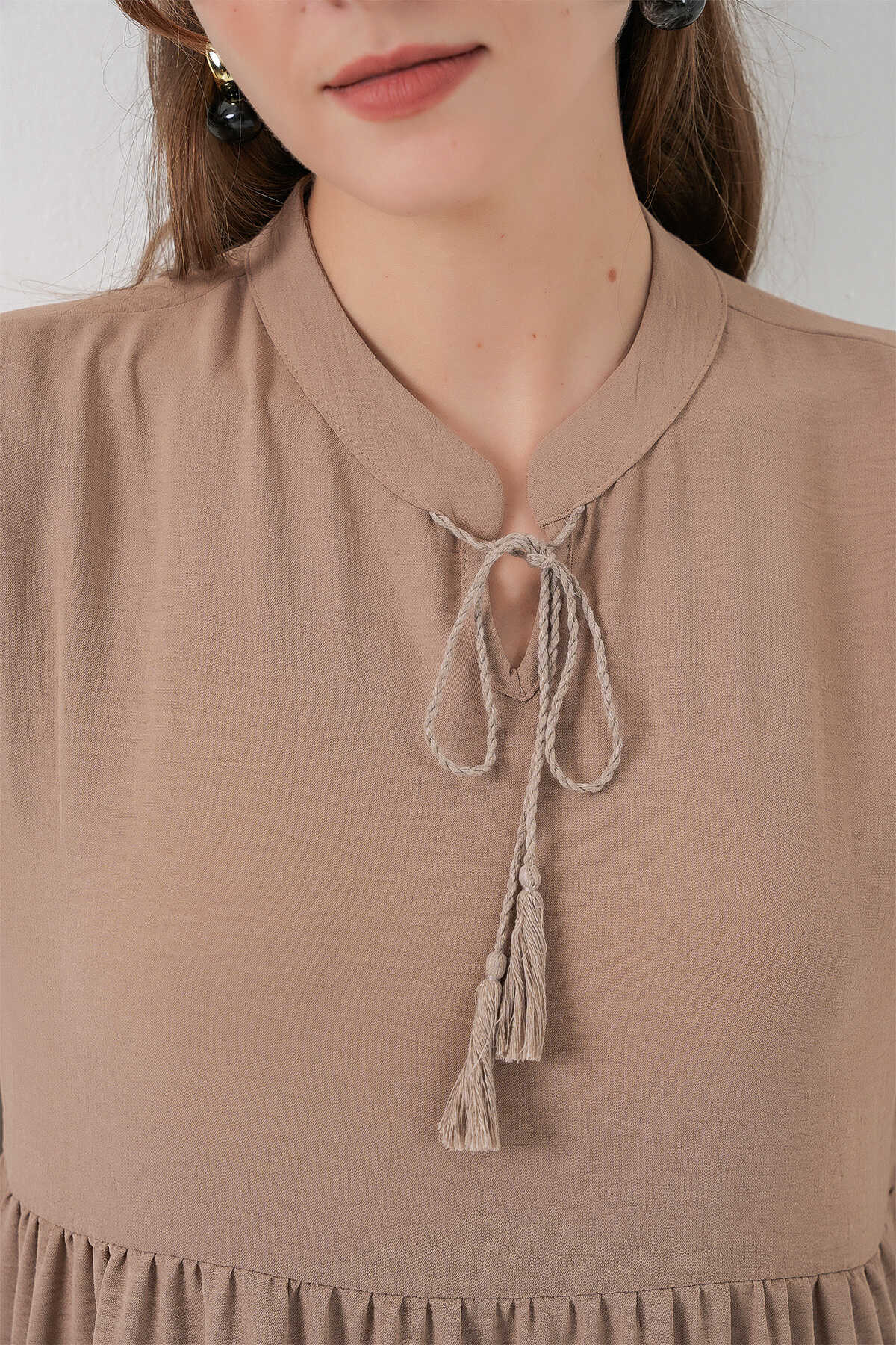T1627 Yaka Bağcıklı Elbise - Y.Bej