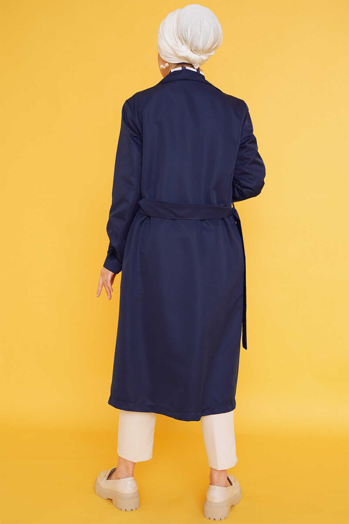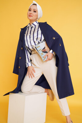 T5853 Kruvaze Yaka Tesettür Trençkot - Lacivert - Kombin