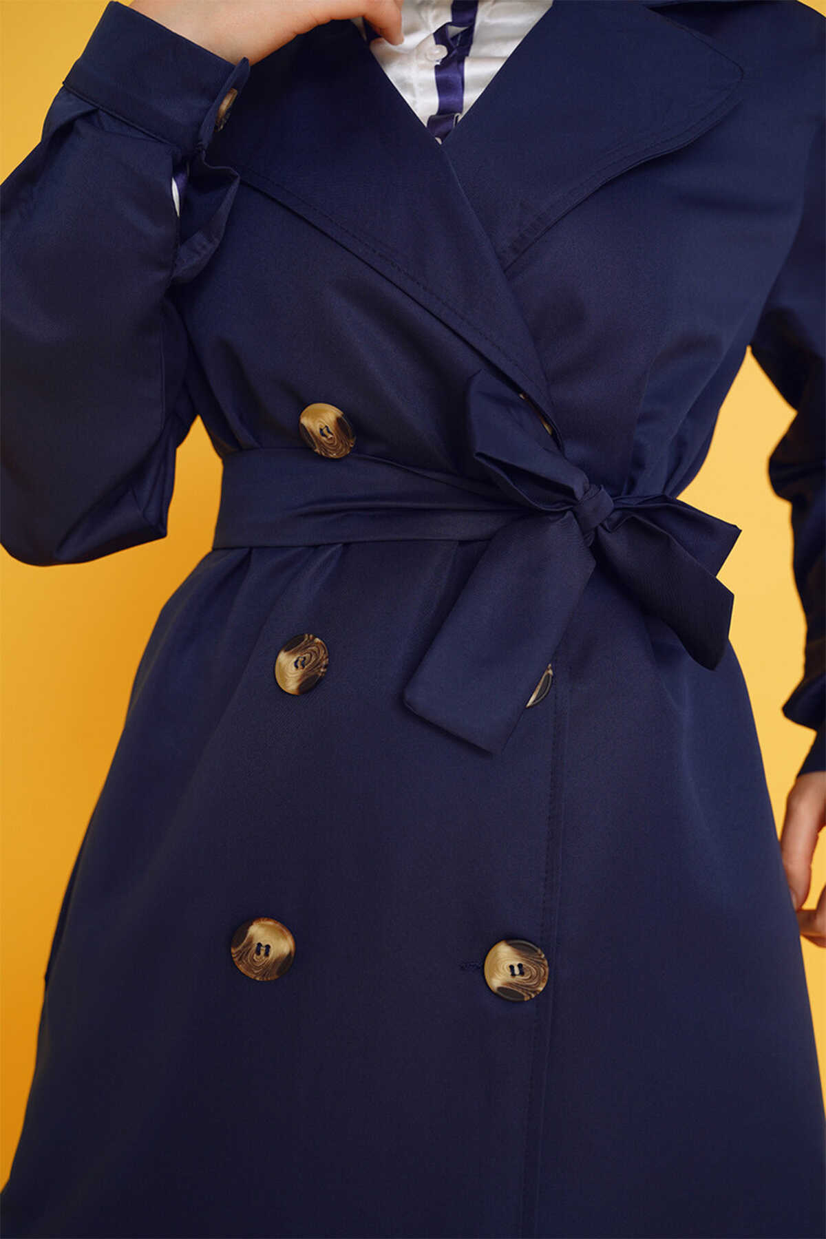 T5853 Kruvaze Yaka Tesettür Trençkot - Lacivert