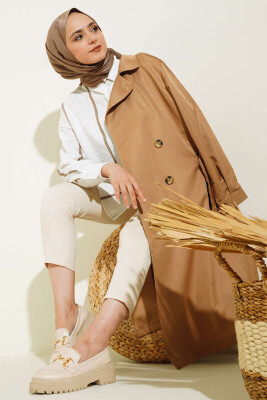T5853 Kruvaze Yaka Tesettür Trençkot - Taba