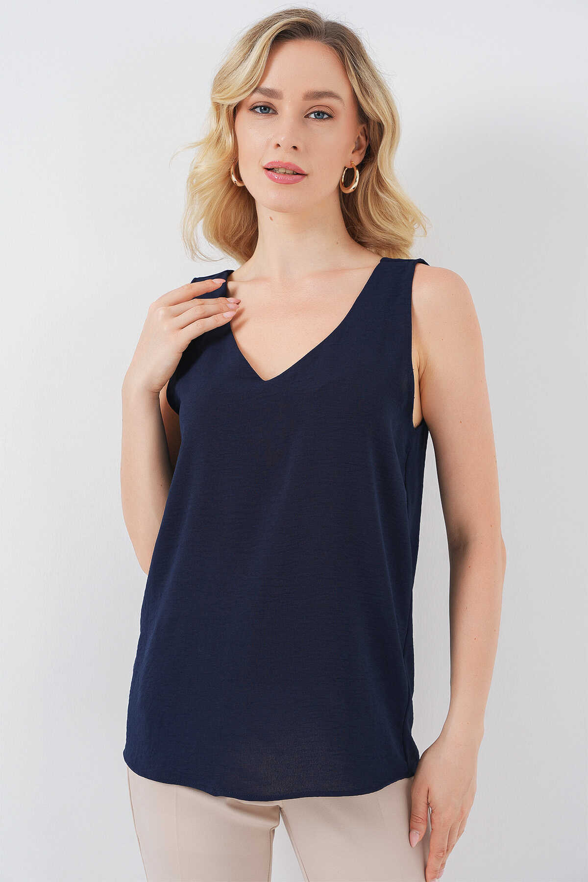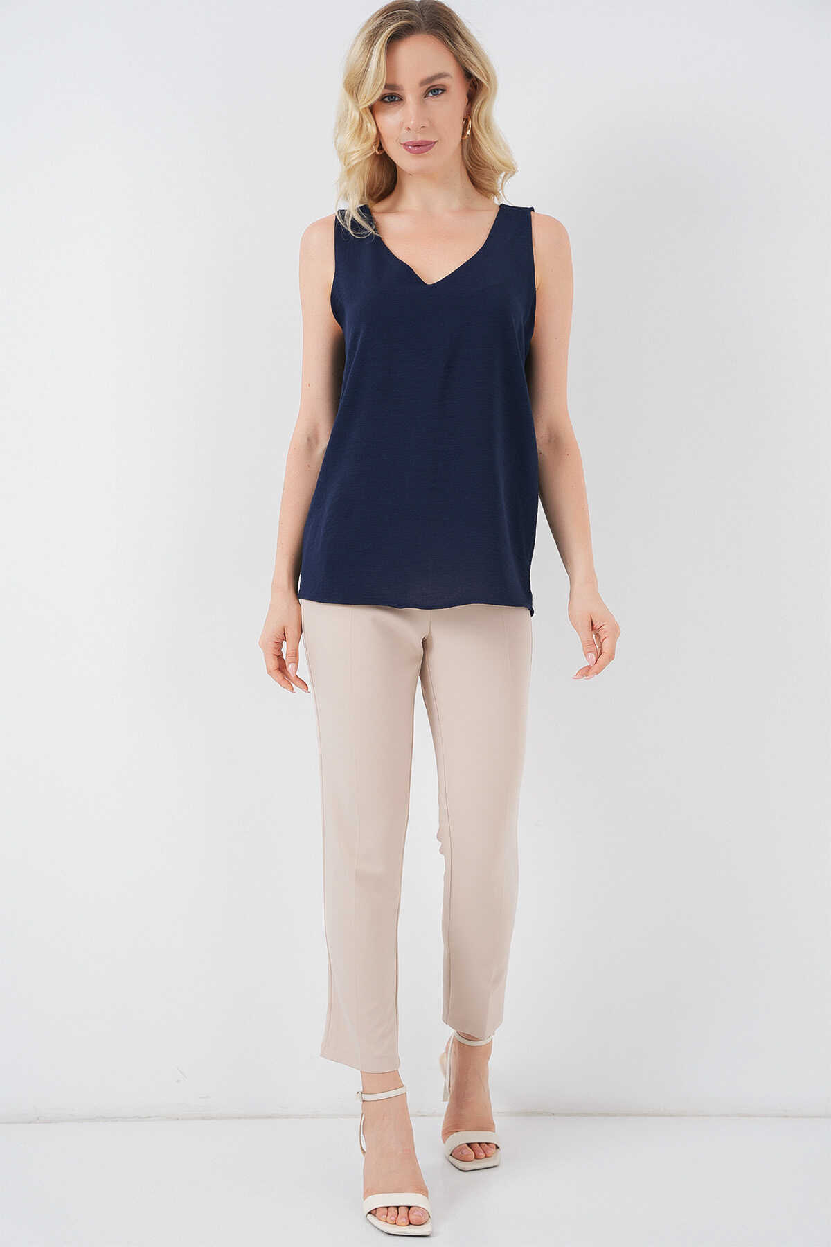 V Yaka Sıfır Kol Bluz 950 - Lacivert - Kombin