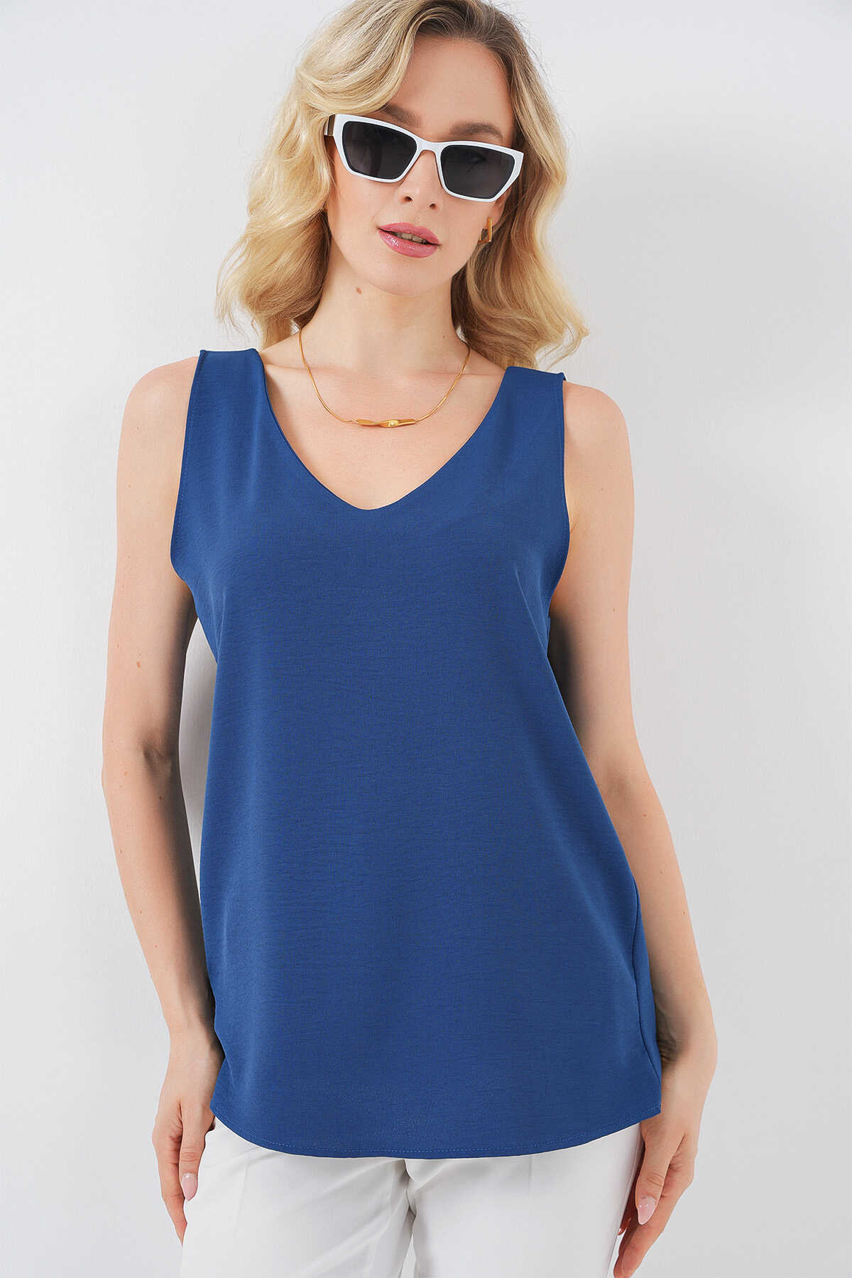 V Yaka Sıfır Kol Bluz 950 - Saks - Kombin